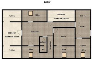 A főépület 420 nm, az emeleti rész 1,9 méternél magasabb területe 81 nm, a melléképület 72 nm. Az épülethez padlástér és pince és parkoló is tartozik.